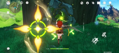 Воздействуйте Дендро на бутон соцветия. Возьмите дендрогранумы тут же и перелетите по четырехлистным символам к следующей платформе, чтобы разрушить Дендро печать и открыть сундук.