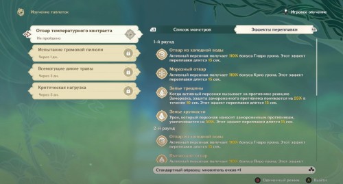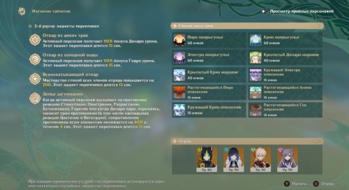 Учитывая вышесказанное, мы советуем вам сконцентрировать свое внимание на реакции Заряжен (Электро + Гидро), взяв соответствующих героев. Следует также обязательно держать в отряде хорошего целителя, так как враги будут постоянно накладывать Разложение, которое проникает сквозь щиты и постепенно снижает здоровье персонажей. Оптимальный отряд показан в таблице ниже.