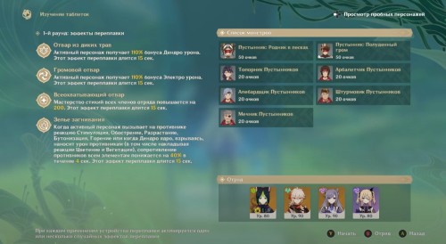Драться придется с пустынниками, плесенниками и автоматонами. В каждом раунде при этом будет даваться бонус к Дендро урону и реакциям на его основе, поэтому команда обязательно должна включать в себя персонажей соответствующей стихии. К счастью, игра предоставляет их бесплатно. В таблице ниже показаны оптимальные отряды для всех этапов.
