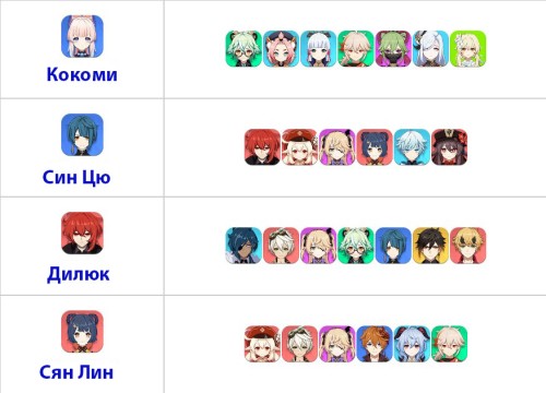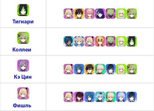 На картинке ниже показаны пробные персонажи и герои, которые прекрасно сочетаются с ними. Главное убедитесь, что в команде имеются Пиро и Электро бойцы.