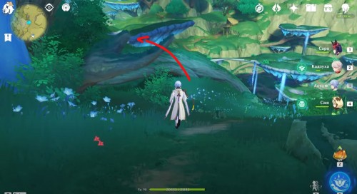 Переместитесь к телепорту, расположенному к юго-востоку от леса Мотийимы (смотрите скриншоты ниже) в пещере с Электро папоротником. Затем начните подниматься по склону наверх, чтобы выбежать наружу. Оказавшись на поверхности, сразу же сверните налево, а потом заберитесь на скалу, используя цветы, восстанавливающие выносливость.