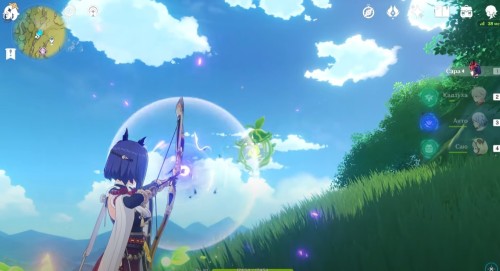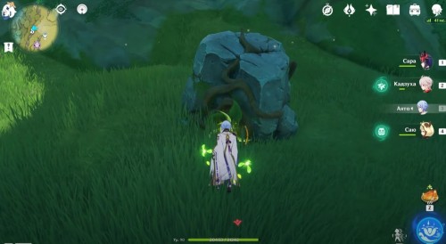 После этого возникнет зеленый барьер, за которым скрывается мята. Возьмите лучника, снова призовите дендрогранумы и выстрелите в Дендро мишени, парящие слева и справа от купола. В результате силовое поле спадет, и вы сможете подобрать растение. Далее разберитесь с Пиро попрыгуньей.
