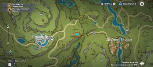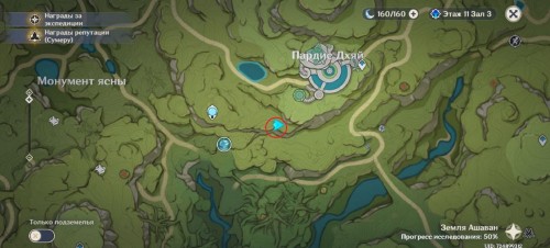 От телепорта в Пардис Дхяй идите на юго-восток. Сначала победите хиличурлов, затем возьмите дендрогранум неподалеку и откройте вход в башню.
