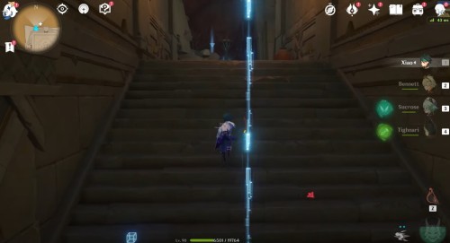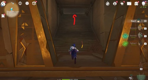 Переместитесь к телепорту, показанному на изображениях ниже, и спрыгните с обрыва вниз. Поднимитесь по лесенке и войдите в проход впереди. Взберитесь еще выше по ступенькам.
