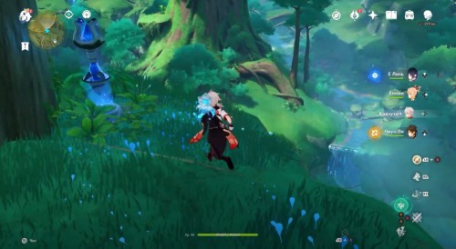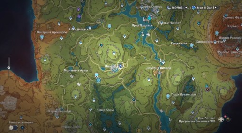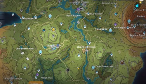 Нужная зона поиска расположена в лесу Авидья (Сумеру), неподалеку от деревни Гандхарва. Переместитесь к телепорту на севере, и вы сразу же окажитесь на границе отмеченной области, поэтому можете поставить Мудрость Бану, чтобы узнать в какую сторону идти. Двигайтесь на юг и спрыгните с холма вниз.