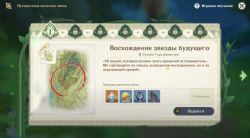 В награду за выполнение этого задания вы получите 20 тысяч моры, 2 книги героя и инструмент Мудрость Бану. Теперь вы можете взяться за выполнение самих испытаний, но для начала ознакомьтесь с небольшим туториалом по поиску звезд.