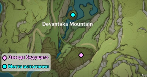 Зона поисков расположена на горе Девантаки. Переместитесь к статуе дендро архонта, а затем используйте новый инструмент, чтобы найти местонахождение первой подсказки. Напомним, что чем уже будет исходящий от него луч, тем ближе находится нужная вам точка.