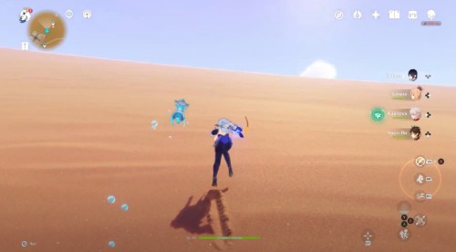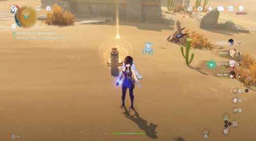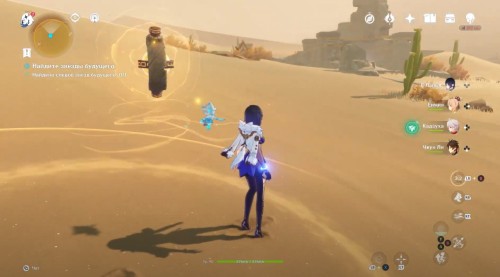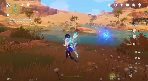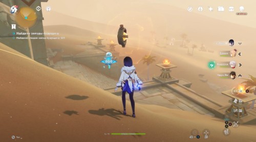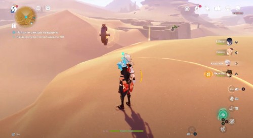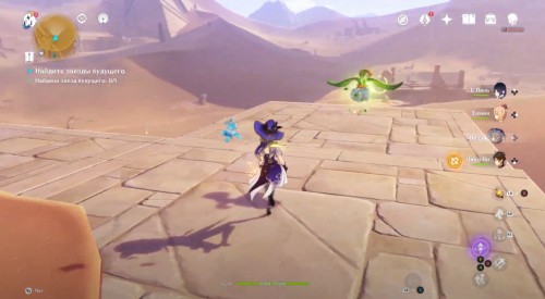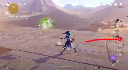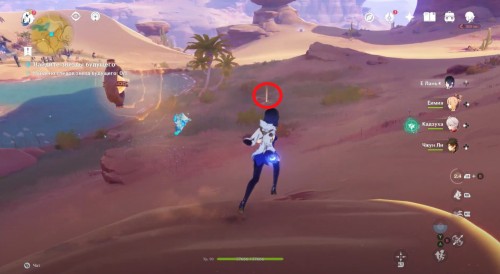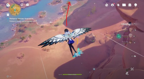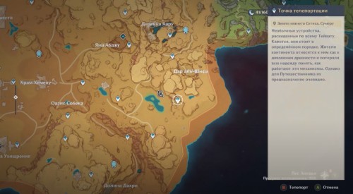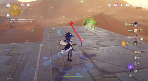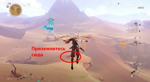 Нужная зона поисков расположена в пустыне Сумеру, неподалеку от оазиса Собека. Переместитесь к показанному на картинках ниже телепорту. После этого сразу же бегите вперед и спрыгните с обрыва вниз. Летите к выступу на северо-западе и приземлитесь на него.