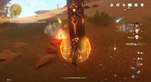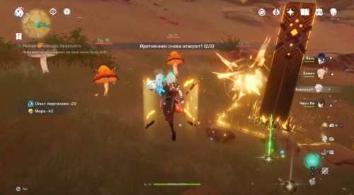 Затем коснитесь механизма и отдайте ему 6 собранных кристаллов. Сразу после этого на вас нападут две волны противников. Первая будет состоять из двух плесенников разных стихий и Гидро моровика, а вторая – из Дендро и Электро плесенников, а также одного Дендро моровика.