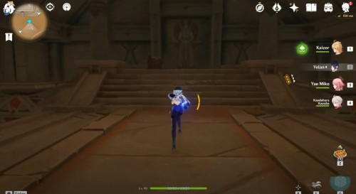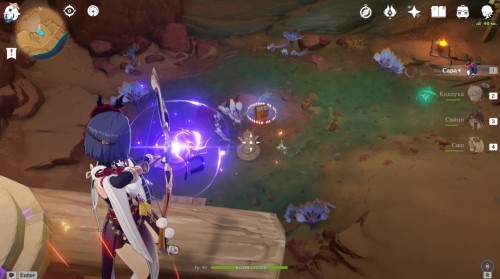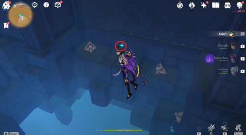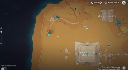 Далее переместитесь к статуе Дендро Архонта и спланируйте немного на юго-восток. В указанной на карте расщелине вы обнаружите новый проход. Спуститесь по нему вниз, и вы окажитесь в просторной подземной области с Электро монументами, закрытыми барьерами.