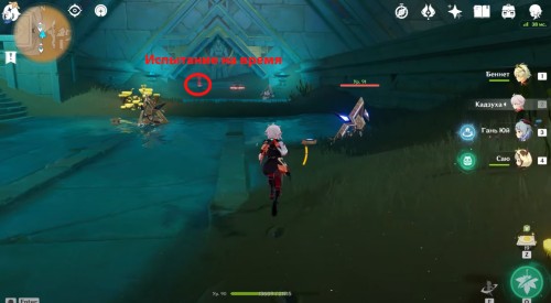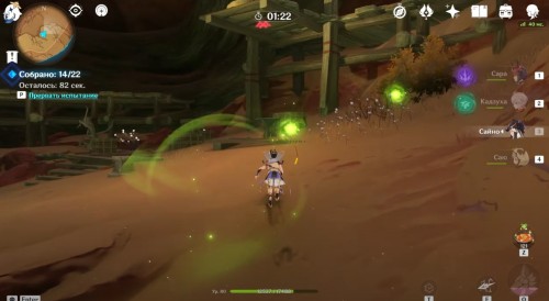 В третьем испытании (справа) нужно собрать 22 Дендро частицы за 100 секунд. Просто двигайтесь по маршруту, показанному ниже. Выполнив все три челленджа, активируйте разблокированные монументы, ударив по ним Электро атаками.