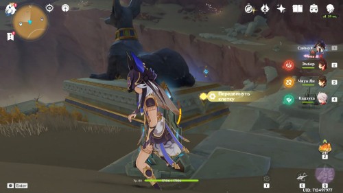 Решение данной загадки заключается в почти одновременном передвижении светопроводящих клеток. Заранее возьмите в команду Пиро стрелка. Встаньте так, как показано на скриншоте, чтобы камера захватывала быстрое перемещение по четырехлистным символам. Передвиньте клетку и быстро переместитесь на противоположную сторону, чтобы переместить клетку, расположенную за статуей сфинкса.