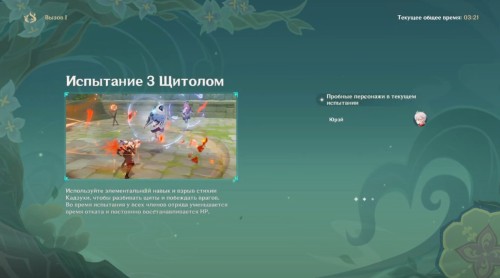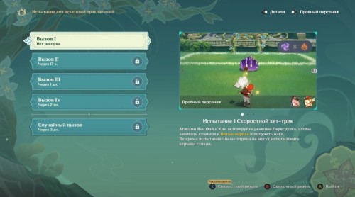 Добавим, что в ряде испытаний предусмотрены специальные условия применения способностей героев. К примеру, в «Скоростном хет-трике» нужно активировать Перегрузку ударами Кли и Янь Фэй, чтобы закидывать слаймов в ворота. Персонажи при этом не смогут использовать свои ульты.