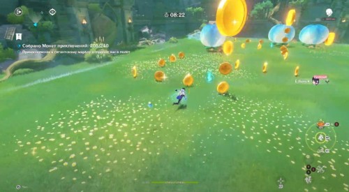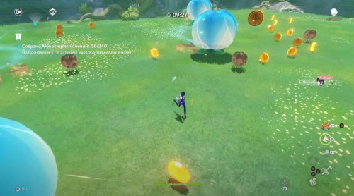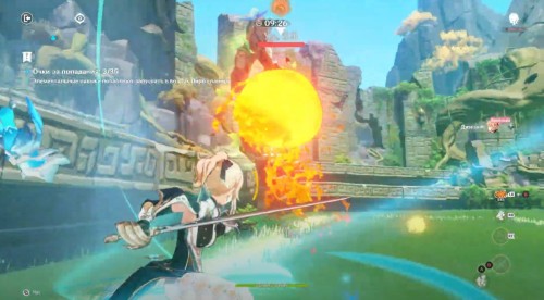 В этой мини-игре, управляя Кли и Янь Фэй, вам нужно будет вызывать реакцию Перегрузка (Пиро + Электро) для забрасывания слаймов в Витые ворота. Попадая «мячом» в цель, вы будете зарабатывать очки – за 10 минут необходимо набрать не менее 35 очков.