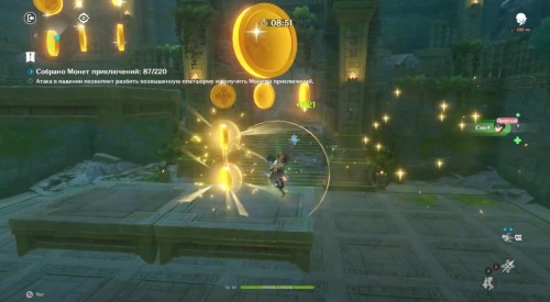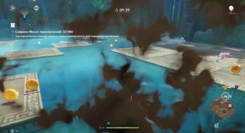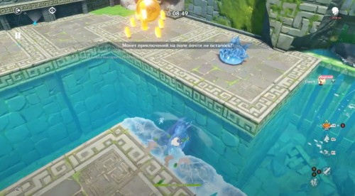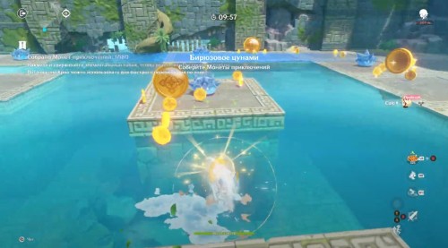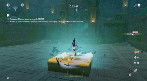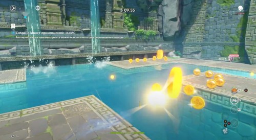 Появившись на каменной площадке, примените элементальный навык, а затем проезжайте прямо через Крио слайма, чтобы получить Крио эффект. После этого вы можете спокойно двигаться к воде, так как вы сразу же будете ее замораживать, создавая тем самым себе мост. Перебирайтесь на другие платформы, проезжая по слаймам и собирая монетки.