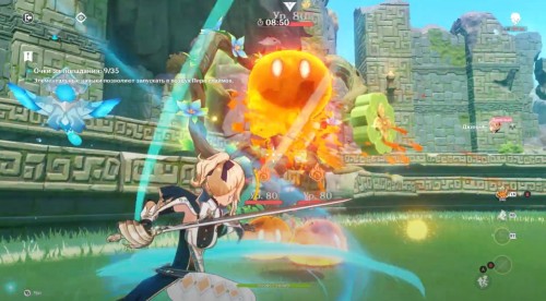 Не советуем использовать элементальное умение Кли на больших скоплениях слаймов, так как с высокой вероятностью они попросту разлетятся в различные стороны – лучше ударьте их обычной или заряженной атакой. В целом, пройти это испытание можно одной Янь Фэй, ни разу не переключившись на другую героиню.