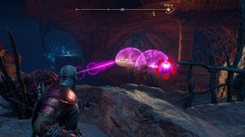 Оставшиеся две жаровни расположены рядом друг с другом за небольшим прудом с лавой. Чтобы добраться до них, вначале выйдите обратно через отверстие и поверните направо. Вы увидите щель, через которую можно разглядеть факел с руной «С». Разместите фиолетовые метки на каменных колоннах и активируйте их при помощи клинков – в результате вы зажжете вторую жаровню.