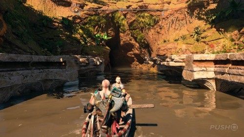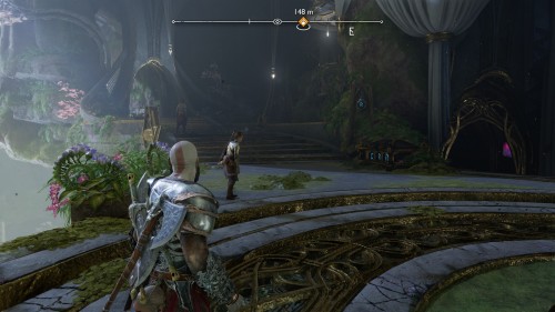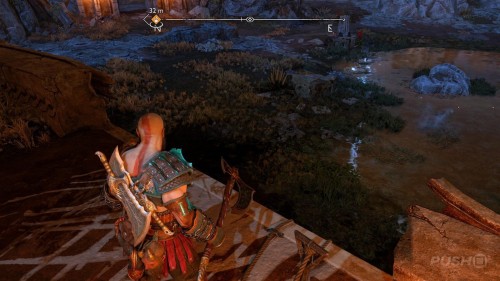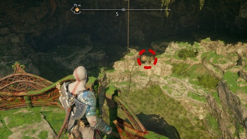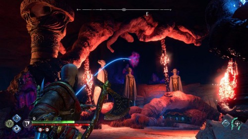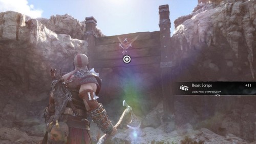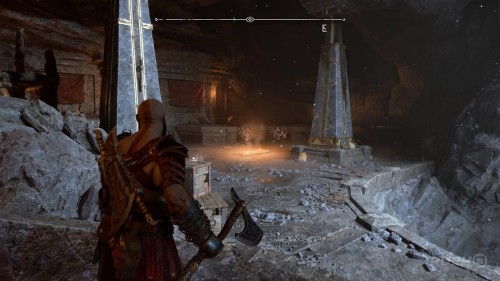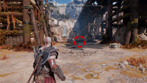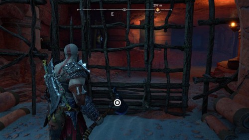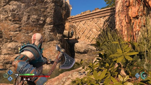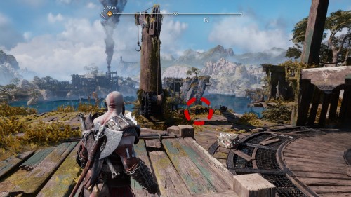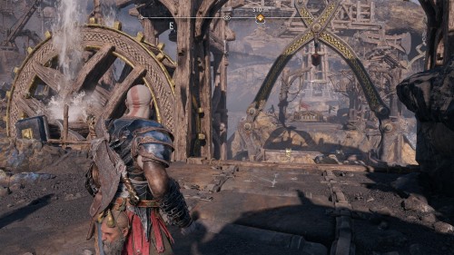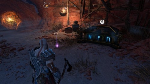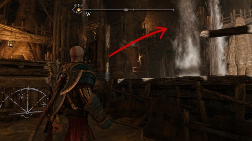 Тотем с символом «F» расположен на деревянном помосте – он установлен на камне рядом с двумя вагонетками, которые Кратос отсоединил и выбросил, когда вы впервые прошли через этот район.