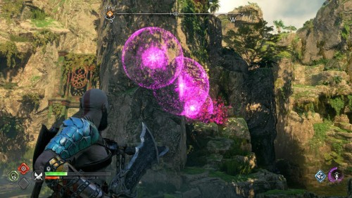 Вначале посмотрите направо от сундука Норн, чтобы найти первый переключатель, спрятанный за гейзером. Бросьте топор в гейзер, чтобы увидеть ветряк. Далее ударьте его один раз по левой лопасти (или дважды по правой), чтобы на нем высветился знак «D».
