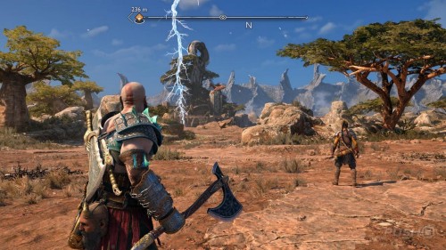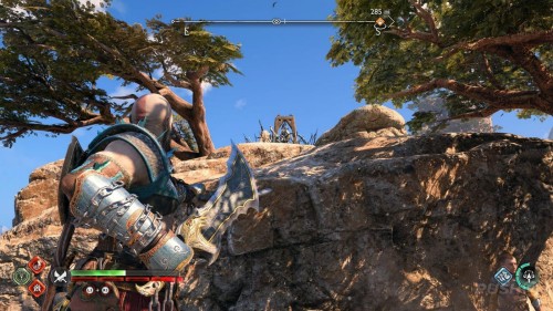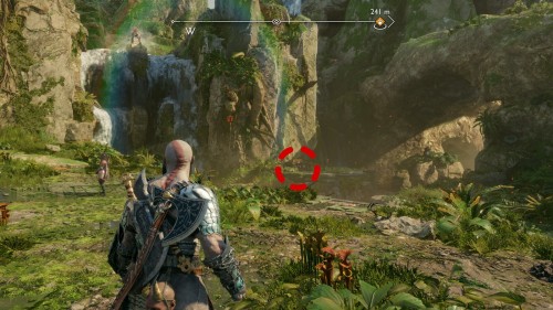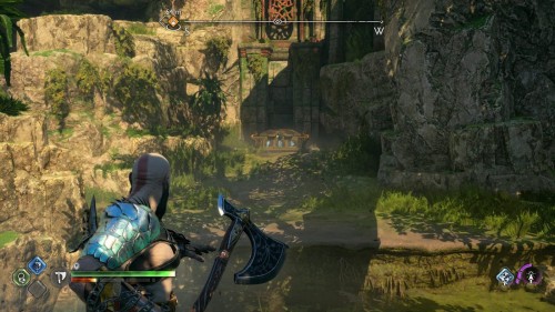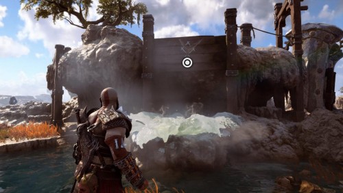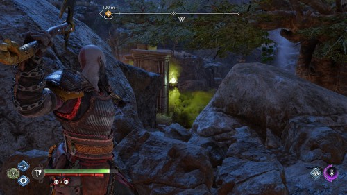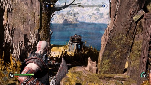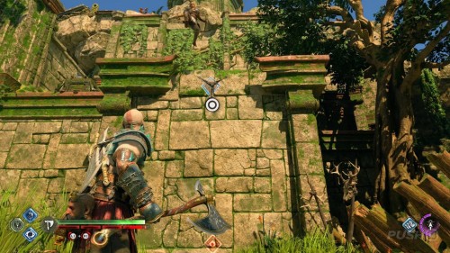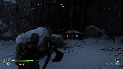 С руной «R» будет посложнее. Перепрыгните через воду и посмотрите налево, чтобы увидеть большой гейзер. Бросьте свой топор в его основание, чтобы заморозить, а затем заберитесь на вершину уступа. Вы увидите каменную фигуру с левой стороны, у подножия дерева.