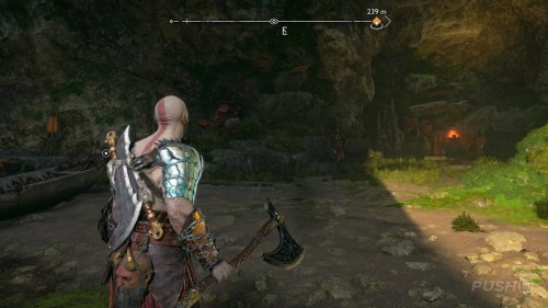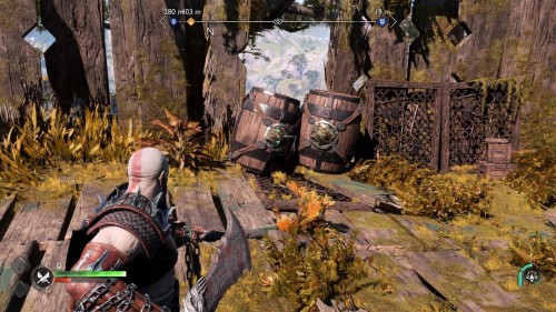 Вторую можно найти слева от него. Киньте топор Левиафана в бочку, стоящую неподалеку, а потом зажгите масло при помощи рунической стрелы, чтобы активировать факел.