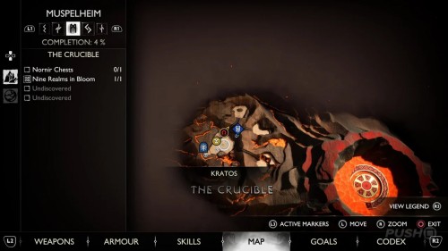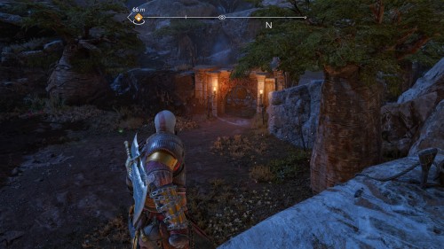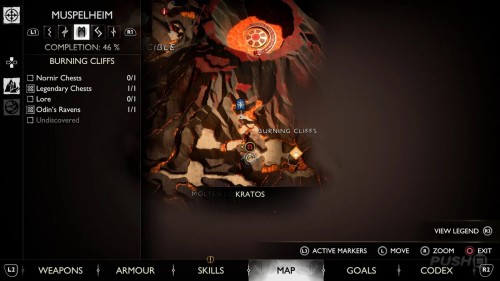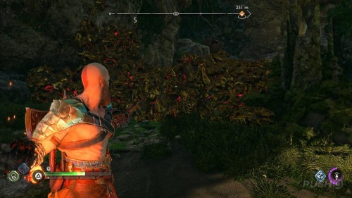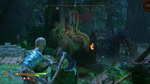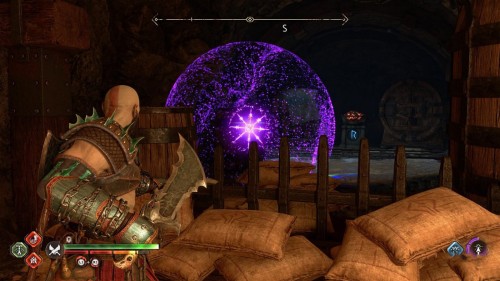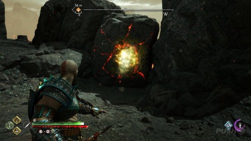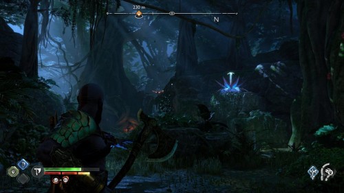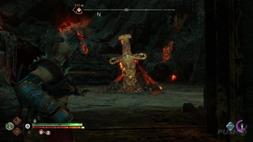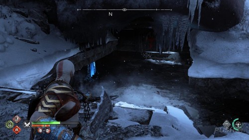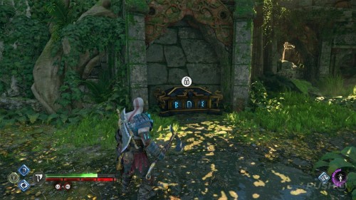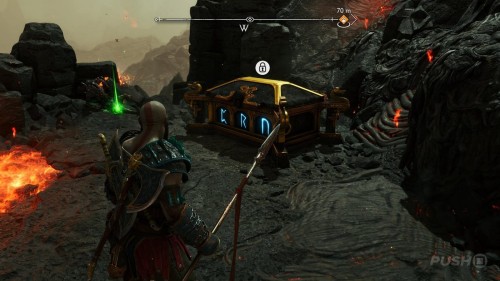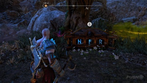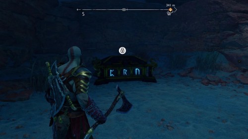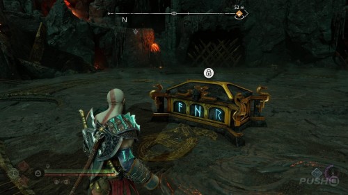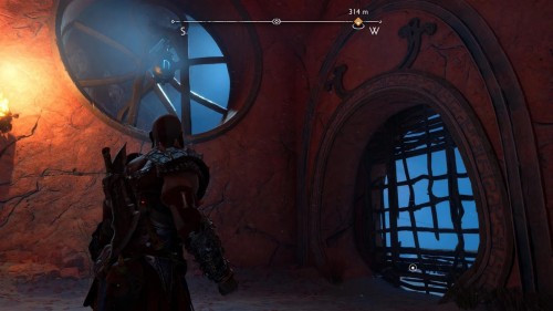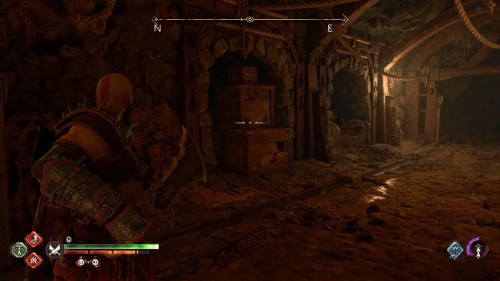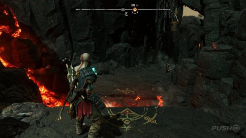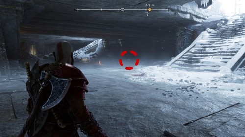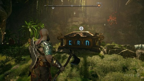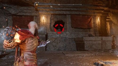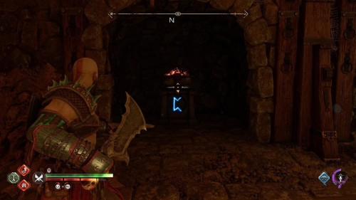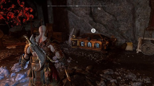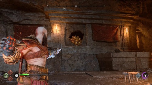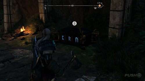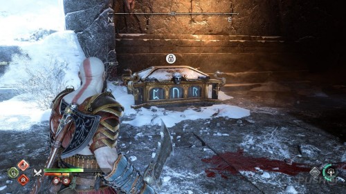 Примечание: Чтобы открыть этот сундук Норн вам нужно будет отыскать и зажечь три рунических факела, используя специальную способность Клинков Хаоса (или другие источники огня). Для применения умения удерживайте L2, дабы прицелиться, а потом нажмите на R2.