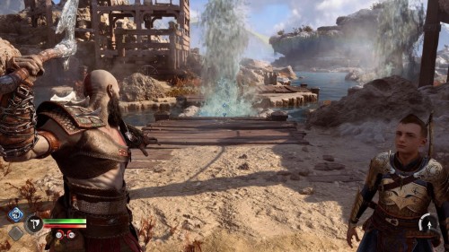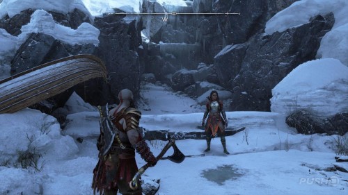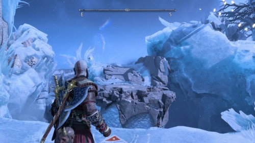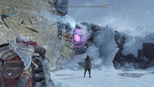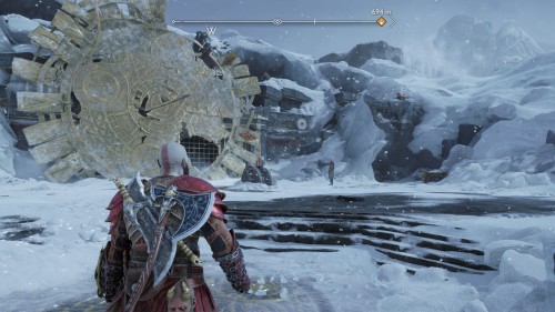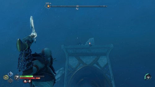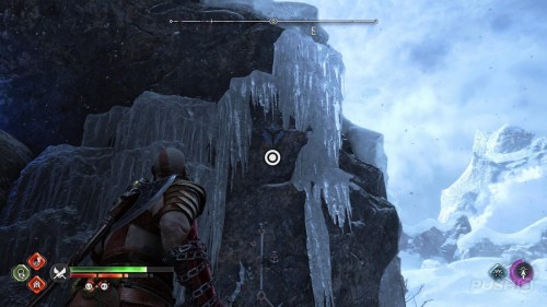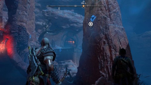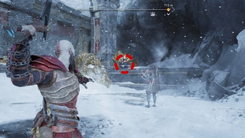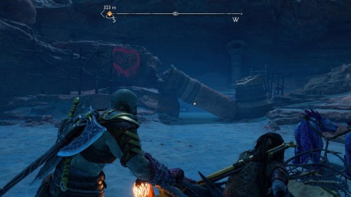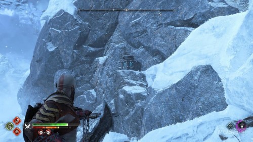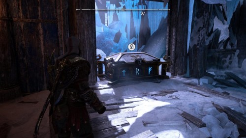 Тотем с руной «B» можно найти справа от сундучка. Пройдите направо и встаньте на край балкона. Найдите желоб с водой впереди и заморозьте его топором Левиафана. Это раскроет расположение монумента. Затем воспользуйтесь новым инструментом, чтобы ударить по нему.