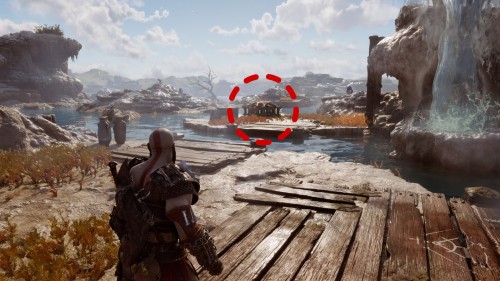 Вы можете обнаружить его при прохождении сюжетной миссии «Поиски Тюра». Вам необходимо будет причалить к берегу, чтобы разблокировать водяное колесо. Идите вперед и заморозьте гейзер, кинув свой топор. Перепрыгните через препятствие, и вы заметите нужный сундучок справа.