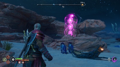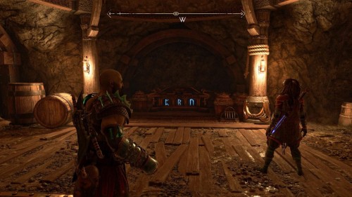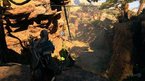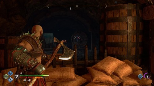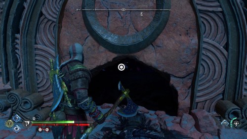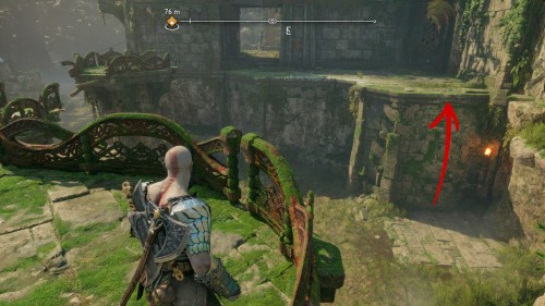 Чтобы добраться до руны «R», идите от сундука Норн по арене по часовой стрелке: перепрыгните через пропасть, и вы увидите впереди две бочки с зелеными пластинами. Выстрелите в них звуковыми стрелами Атрея, чтобы открыть брешь в стене, за которой находится нужный вам факел.