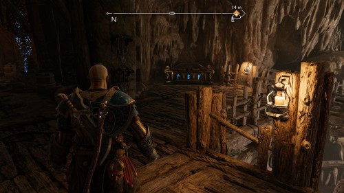 Для обнаружения руны «N» гляньте налево от символа «С» – там вы обнаружите пропасть, через которую можно перелететь, схватившись за красный светильник. Если путь заблокирован большой деревянной вагонеткой, то призовите топор, чтобы поднять контейнер и пройти вперед. Перебравшись на другую сторону, вы тут же обнаружите факел.