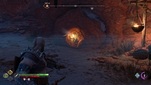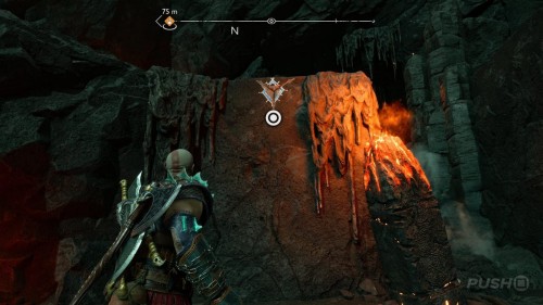 Вы можете отыскать его во время или после прохождения сюжетной миссии «Призыв». Идите по основной дороге, и через несколько минут вам нужно будет пройти под лавовым водопадом. Оказавшись на другой стороне, спрыгните вниз и взгляните вправо – там вы увидите желтую потрескавшуюся стену, которую нужно уничтожить копьем. Прямо за ней будет стоять сундук норн.