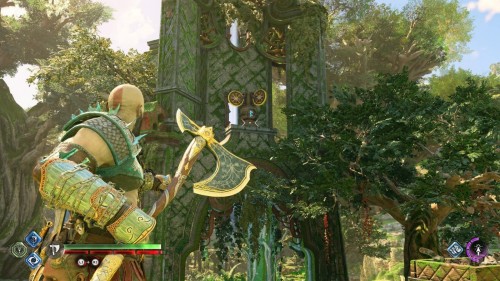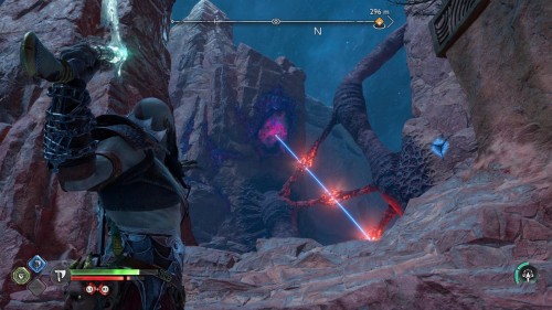Потом поднимитесь по лестнице, которая ведет к Небесному алтарю, и взгляните вправо – вы увидите второй переключатель, покрытый красными лианами. Уничтожьте их фиолетовыми стрелами и Клинками Хаоса, а затем ударьте один раз по правой лопасти, чтобы получить символ «N».