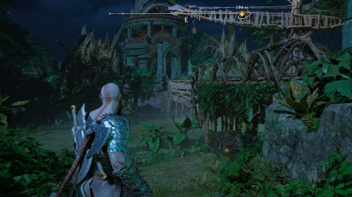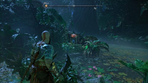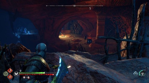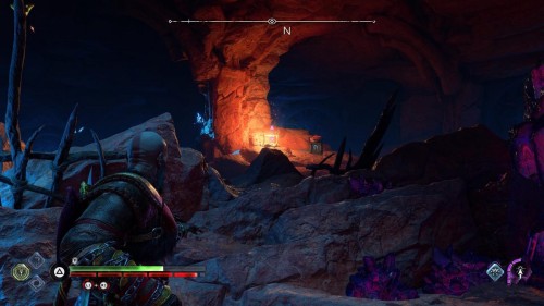 Разобравшись с противником, доберитесь до западного края локации, и вы увидите отравляющий фонарь – киньте в него топор Левиафана и не возвращайте оружие. Далее вернитесь назад по той же дороге, по которой вы пришли сюда. Пройдя через дверной проход, поверните направо и переберитесь через небольшой уступ. Спрыгните и отворите дверь с правой стороны. Расправьтесь с группой противников и пройдите еще немного дальше для нахождения сундука норн.