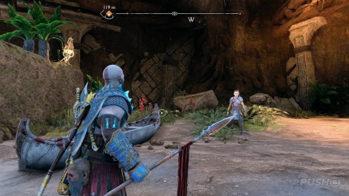 Поднявшись, двигайтесь вперед, и вы обнаружите большой валун с желтой воздушной трещиной. Киньте в него новое снаряжение, а потом взорвите, нажав на кнопку «треугольник».