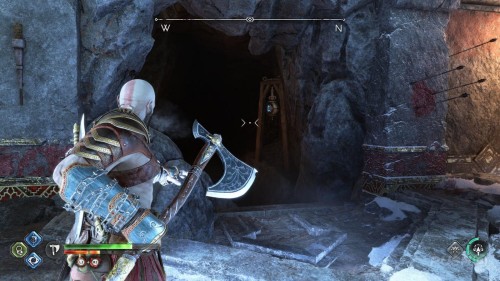 Руна «N» находится справа от большого деревянного строения и напротив сундука норн. Она спрятана за решеткой, убрать которую можно путем удара топором по левой лопасти ветряка, установленного слева от колокола. Однако вскоре решетка снова опустится. По этой причине советуем вам начинать с этого колокольчика, а затем уже бить все остальные.