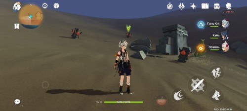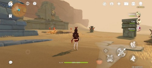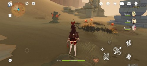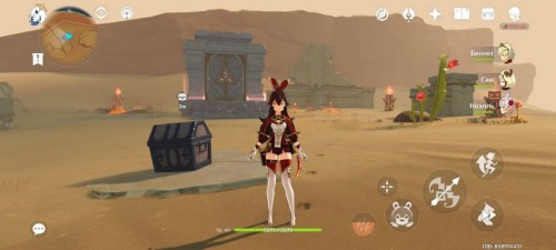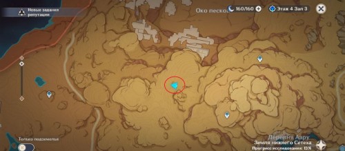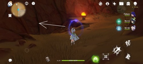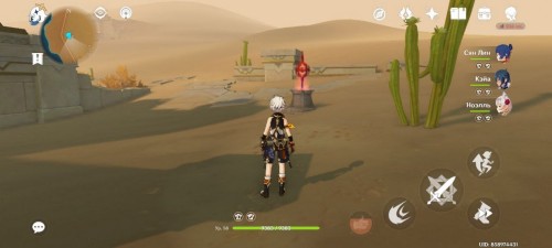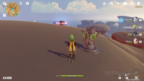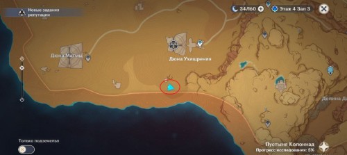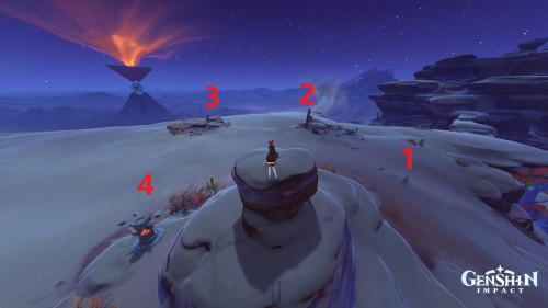 От дюны пройдите на северо-восток. Здесь стоят 4 Пиро тотема с горящим цветком посередине. Если они скрыты песком, то развейте его с помощью Анемо.