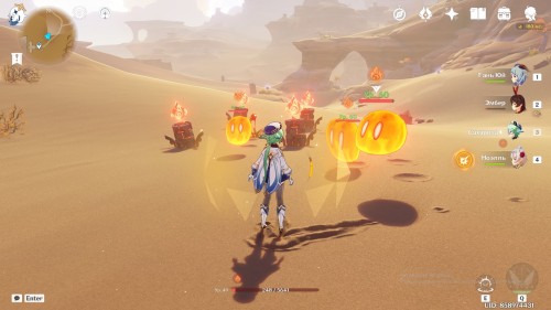 От телепорта пробегите немного на север. Здесь у руин расположено 4 Пиро монумента, рядом с одним из них – Пустынники и взрывоопасная бочка. Тотемы горят недолго, поэтому для большей скорости советуем взять в команду Пиро лучника и каталиста. Лучником стреляем в дальний монумент у бочки, каталистом зажигаем ближайшие тотемы.