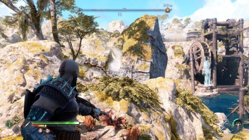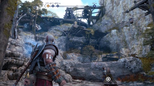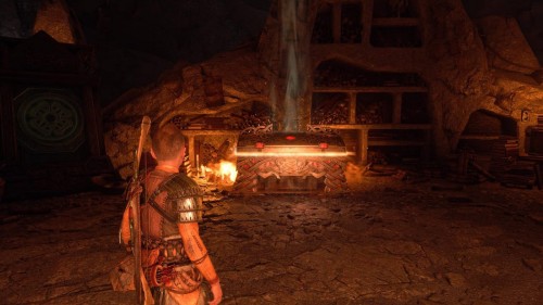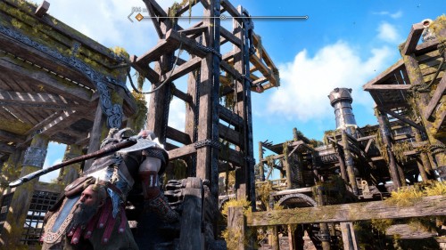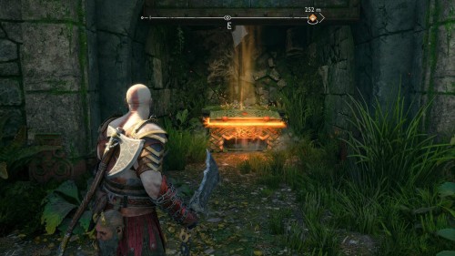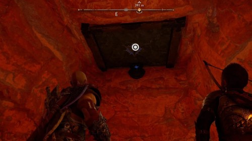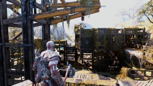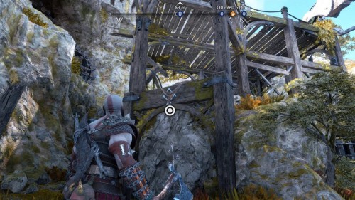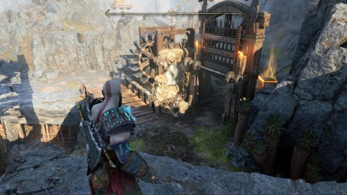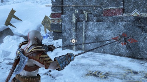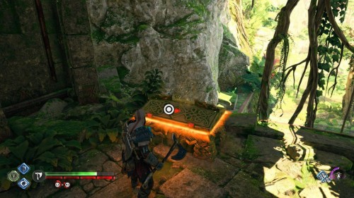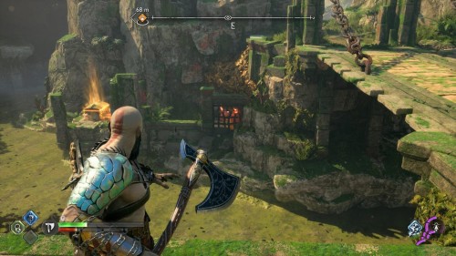 В результате спустится подъемник возле гейзера. Верните свой топор, поднявшись тем самым на верхний уровень. Воспользуйтесь точками зацепа и доберитесь до золотого сундучка.