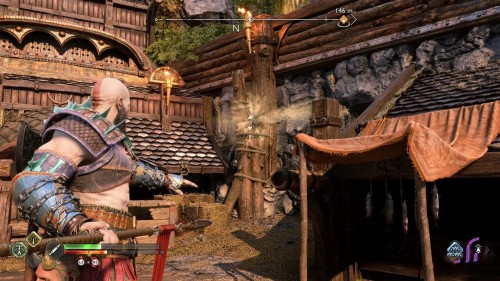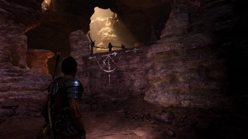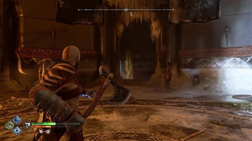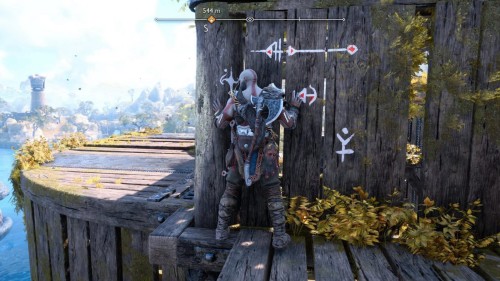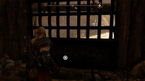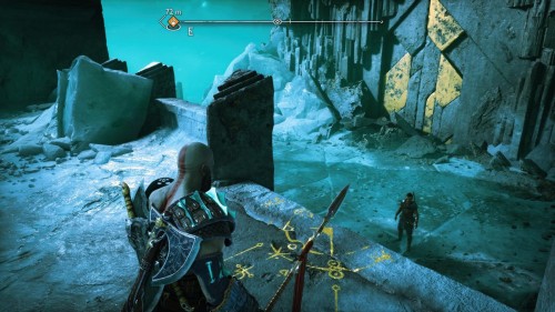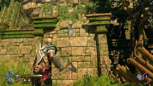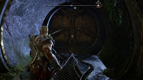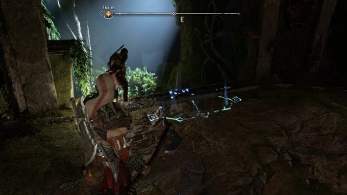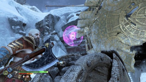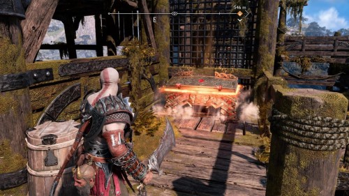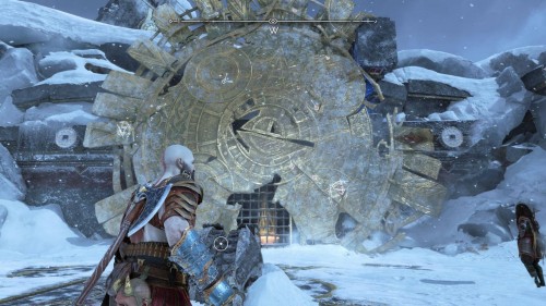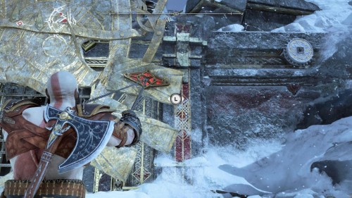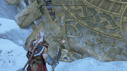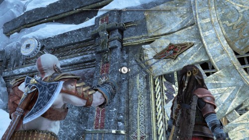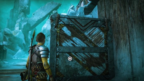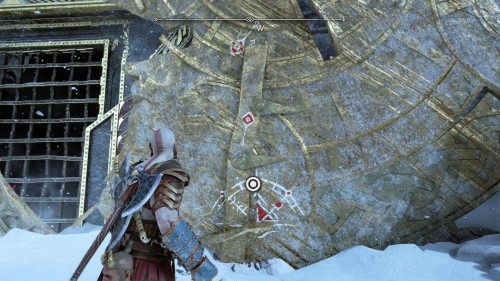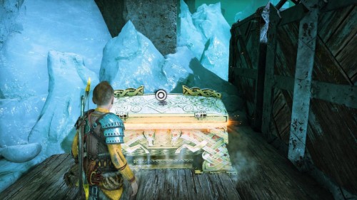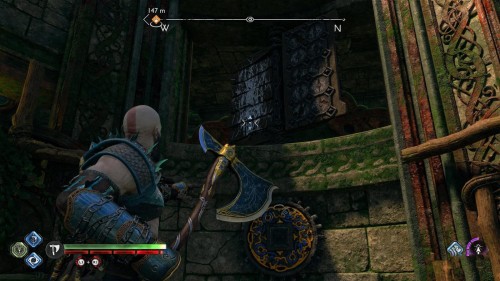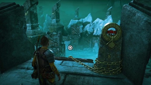 Опять спуститесь и толкните щит направо, чтобы он встал посередине. Взаимодействуйте с колесом для подъема решетки, а потом выпустите руническую стрелу в одну из печатей. Далее киньте в обе шестерни топор, дабы заморозить их. Пробегите внутрь и откройте сундук.