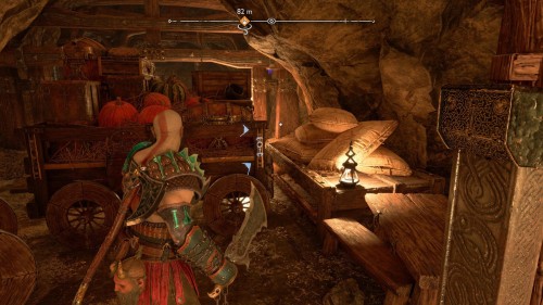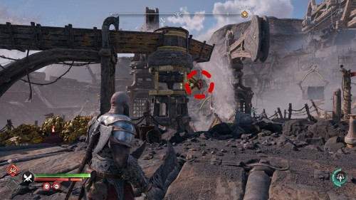 Доберитесь до металлического дымохода наверху, а потом выстрелите звуковыми стрелами в несколько бочонков с правой стороны. Далее обогните препятствие и спуститесь по цепи к вращающейся рукоятке. Установите подъемник на самый верх, а затем заберитесь по цепи обратно, используйте клинки на точке захвата и разрушьте стену прямо в полете. Потом пройдите немного направо, чтобы обнаружить сундучок.