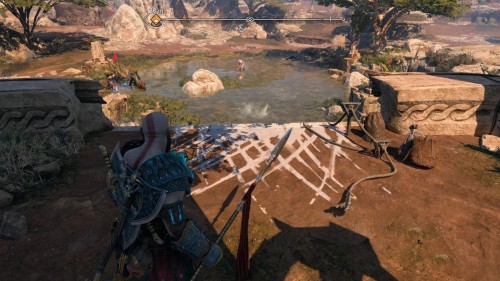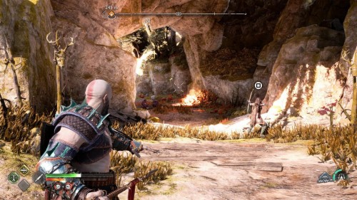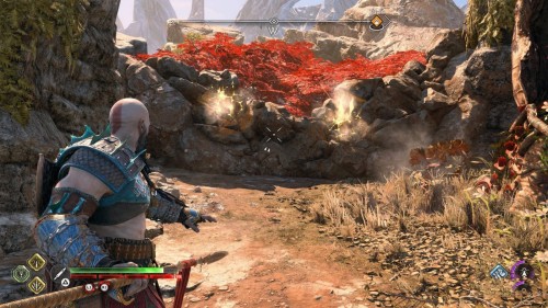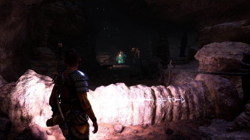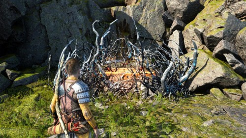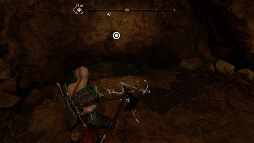 Спуститесь и обойдите данный булыжник с другой стороны, найдя тем самым еще две уязвимые точки. Бросьте во все три копья, а потом подорвите их одновременно, создав тем самым новый проход, который ведет прямиком к сундучку.