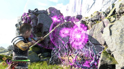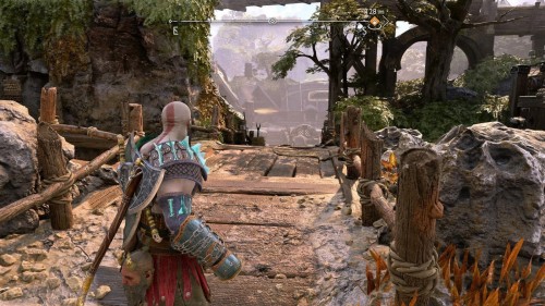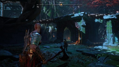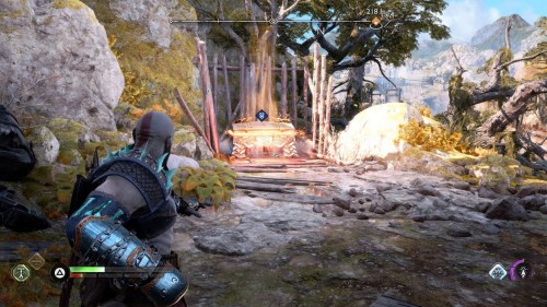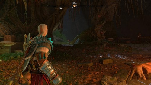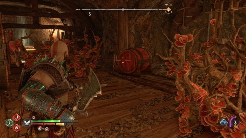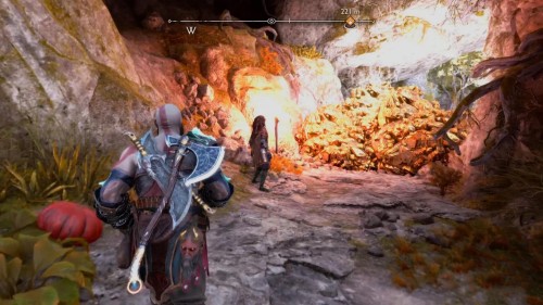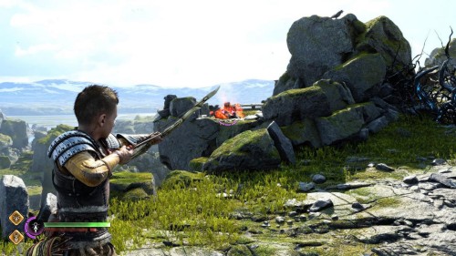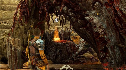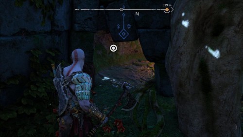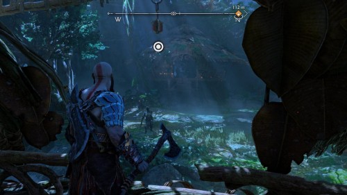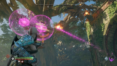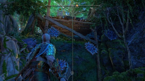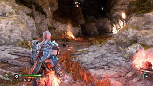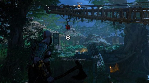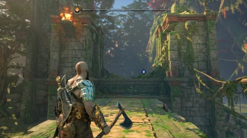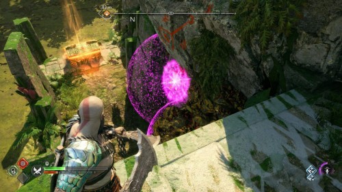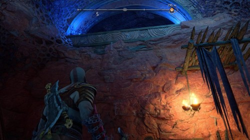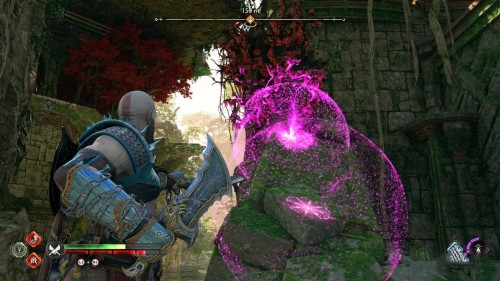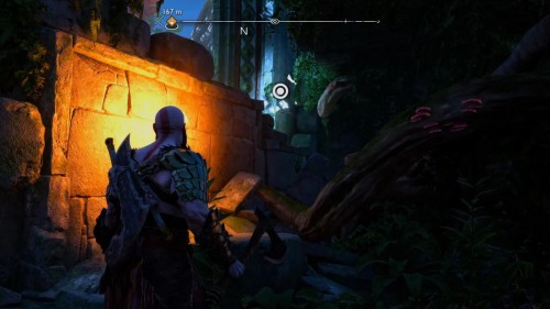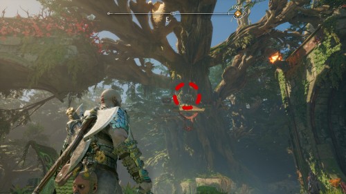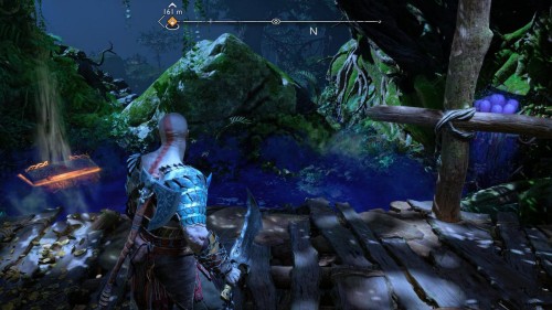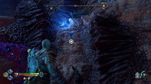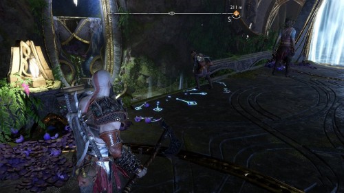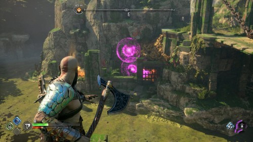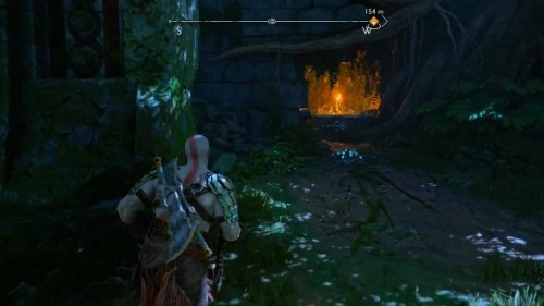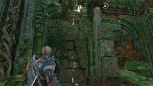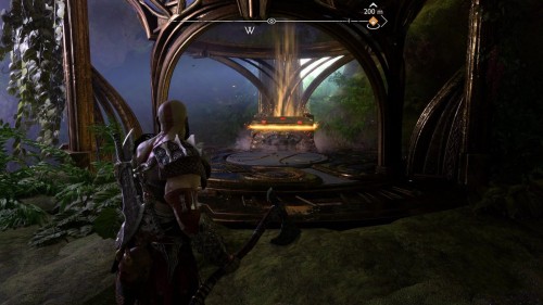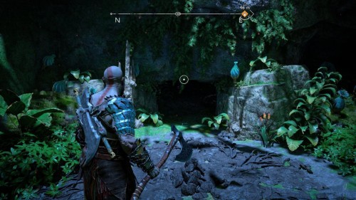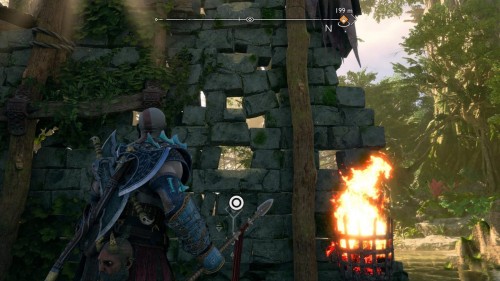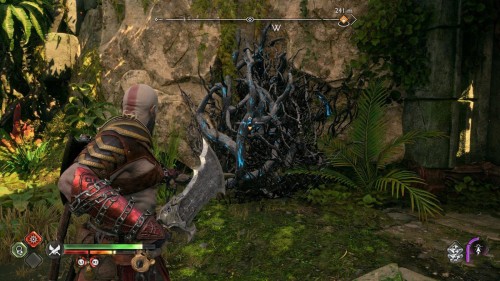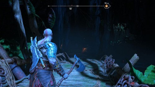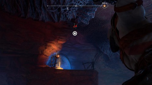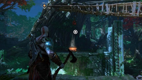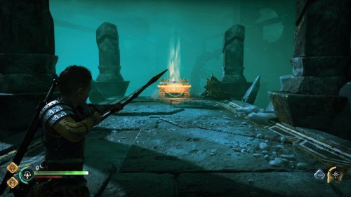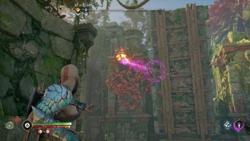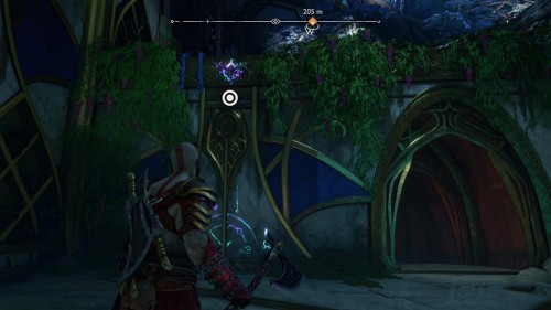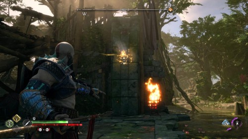 Пройдите направо – там вы обнаружите еще больше синих лиан и источник огня слева. Воспользуйтесь стрелами Атрея, чтобы поместить метки на сундук и соединить их цепочкой с пламенем. В результате вы уничтожите все лозы.