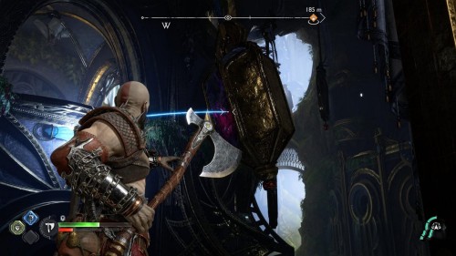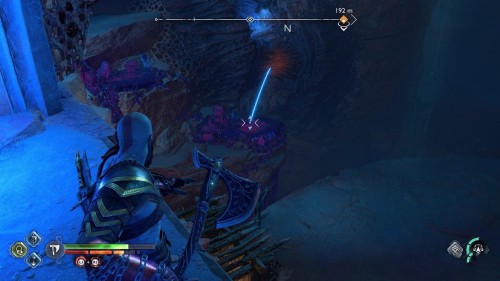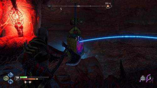 Примените клинки, чтобы раскачать кристалл, а потом бросьте в него топор, когда он будет в правой стороне. Тем самым вы разблокируете путь, ведущий к золотому сундучку – снова используйте точку захвата.