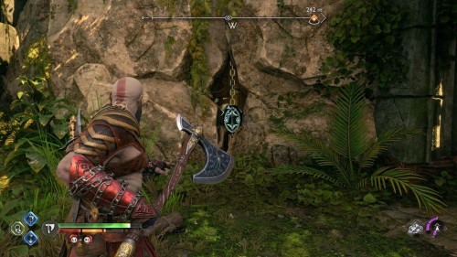 Затем схватите цепь и потяните ее до упора. Продолжая держать цепь, возьмите топор и киньте его прямо в фиолетовый камень. Теперь можете отпустить цепь и возвратить себе топор. Вновь спрыгните и откройте золотой сундучок.