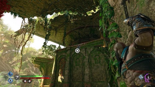 Поднимитесь на стену с правой стороны от Небесного алтаря и продолжайте двигаться вперед по основной дороге. Вскоре вам необходимо будет уничтожить красные лианы, используя фиолетовые метки и клинки. В конце доберитесь до золотого сундучка, воспользовавшись точкой захвата справа.