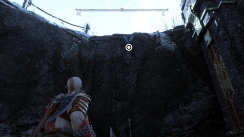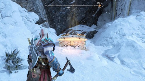 Выполняйте сюжетную миссию «Слово Судьбы», пока волки не доставят вас на северо-восточную дорогу. Начните подниматься по скалам и разрушьте ледяную стену. Потом поднимитесь на еще несколько выступов, однако, не долезая до вершины, вы заметите развилку. Начните взбираться влево, чтобы попасть на уступ с веревкой, позволяющей спуститься вниз. Сделав это, сломайте еще одну стену на противоположной стороне, и откройте золотой сундук.