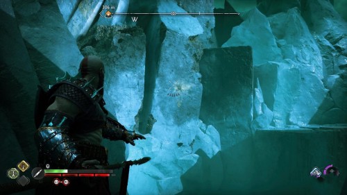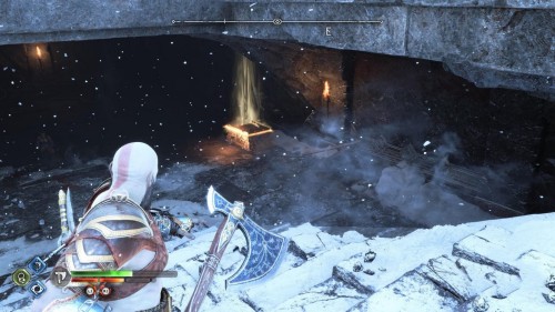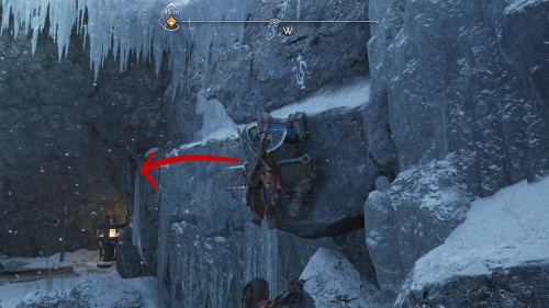 Зацепитесь за каменный блок, а потом заморозьте воду при помощи топора. Вернитесь назад и спуститесь на открывшийся путь. Пройдите немного вперед и вправо, чтобы обнаружить сундучок.