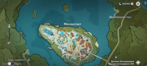 Переместитесь к западной точке телепортации в городе Мондштадт. Сразу оттуда вы увидите крышу здания Ордо Фавониус, где и будет находиться первое сокровище.