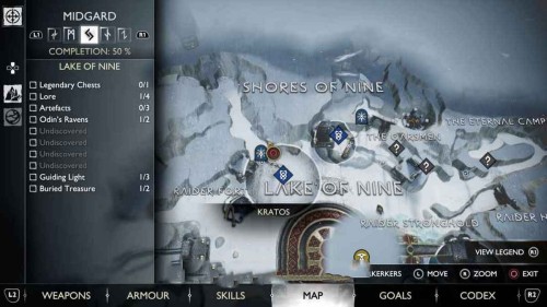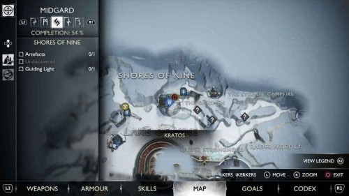 Элементы этого набора можно отыскать в локации Озеро Девяти (Мидгард) рядом с разрушенной статуей Тюра. В рамках просьбы «Путеводный свет» вам нужно будет осмотреть несколько локаций, однако только в трех из них спрятана броня – они показаны на скриншотах ниже.