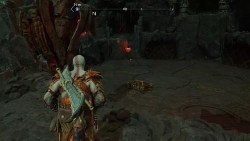 Вы сможете обнаружить его после прохождения сюжетной миссии «Твари пророчества». Доплывите до вышеуказанной локации на лодке от Мистических врат, а потом примените копья, чтобы преодолеть скалы. Далее обойдите скалу слева, перед тем как входить в лагерь. Вы заметите камень, который можно разрушить с помощью копья. Перед вами тут же появится сундучок.